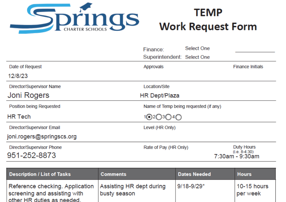 If you require additional classified support at your site, such as for special projects or extra assistance, kindly complete a Temp Request Form and send it via email to Virginia Holley. This form will aid us in promptly evaluating and meeting your staffing requirements.