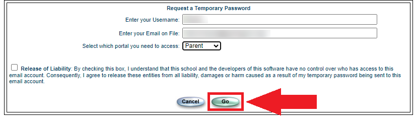 - On the "Request a Temporary Password" pop-up window, fill in your information.