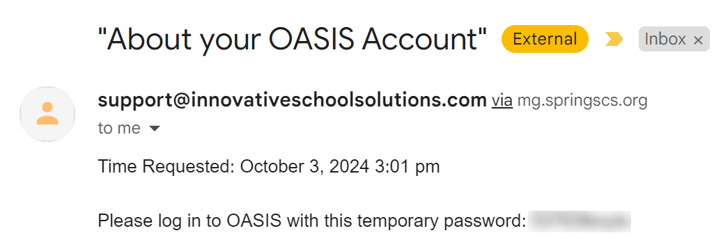 - Check your email to retrieve the password, the email should have the subject "About your OASIS Account".