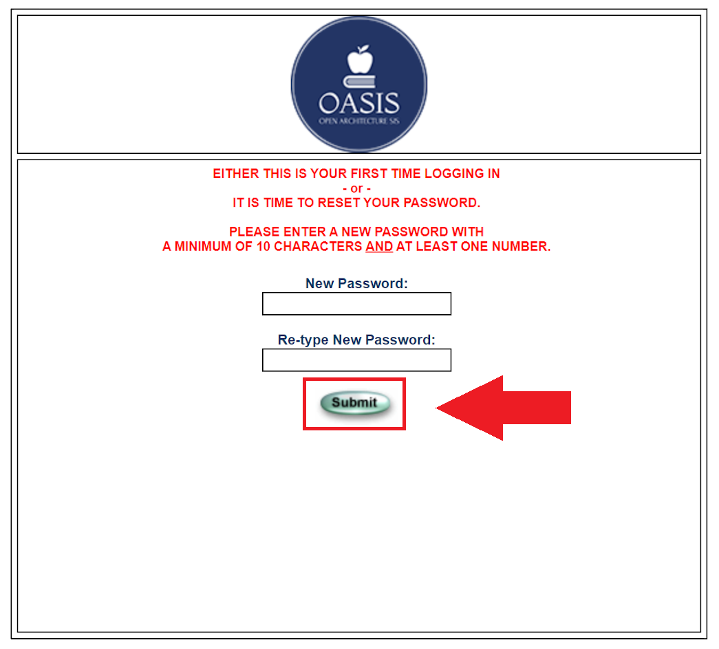 - You will be prompted to create a new password. Enter your new password and click the green "Submit" button.