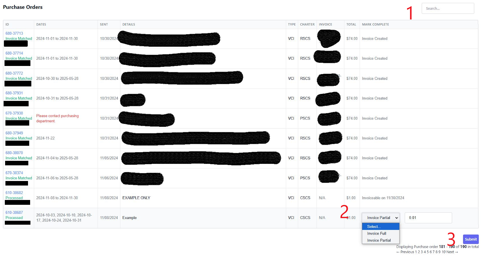 Each row will contain a single purchase order billable a single time per the details. These can be searched using the search bar near the right side to narrow it down by student name and PO number. (1)