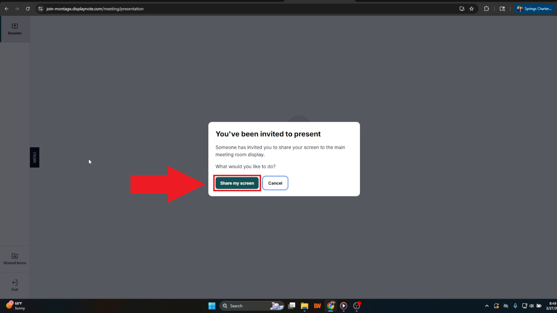 - On your Chromebook, a pop-up saying "You've been invited to present" will appear. Click the "Share my screen" button to continue.