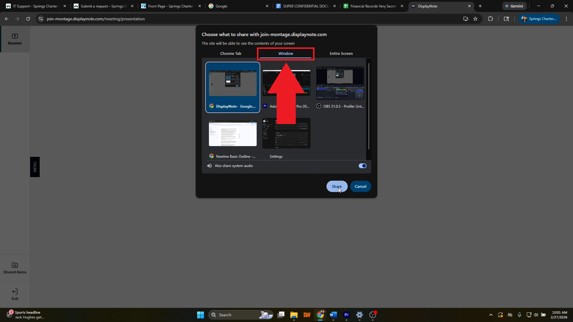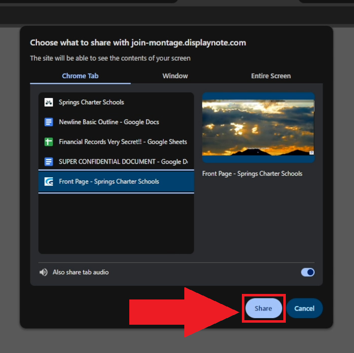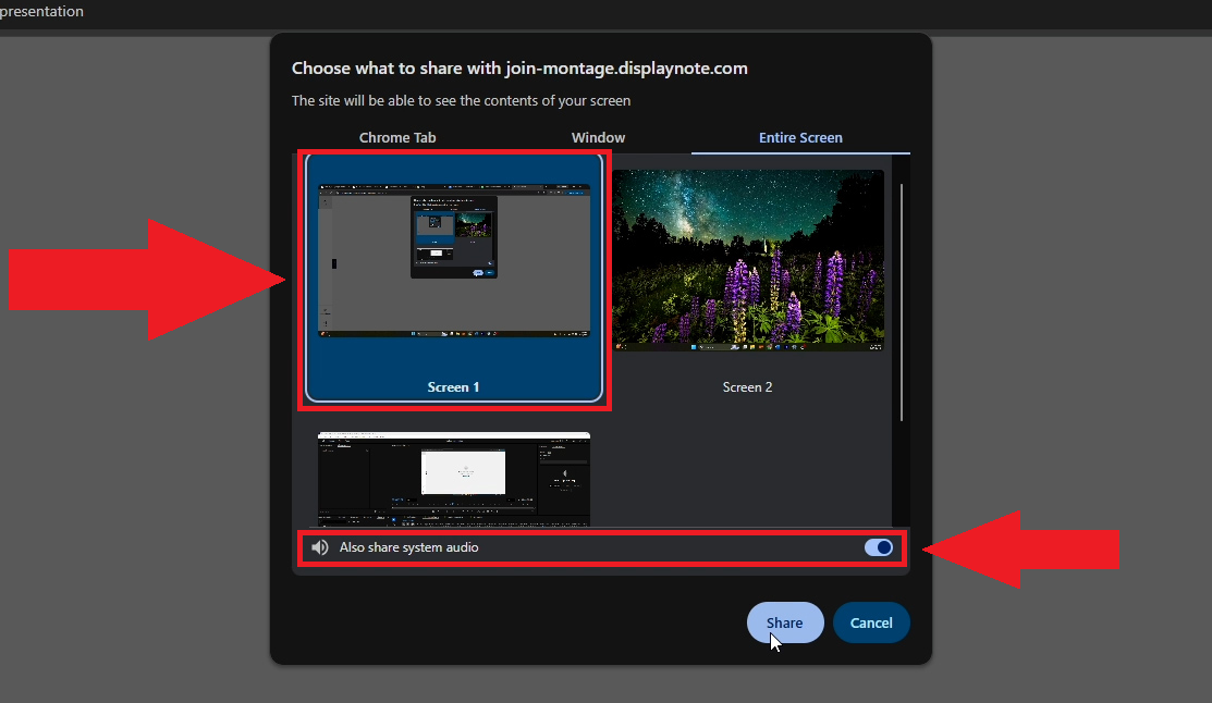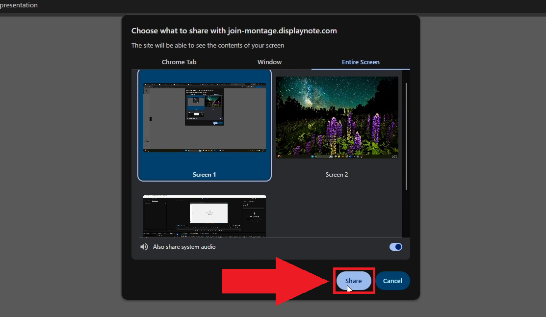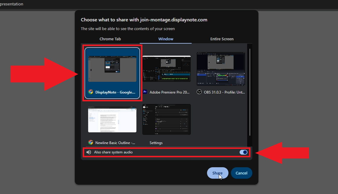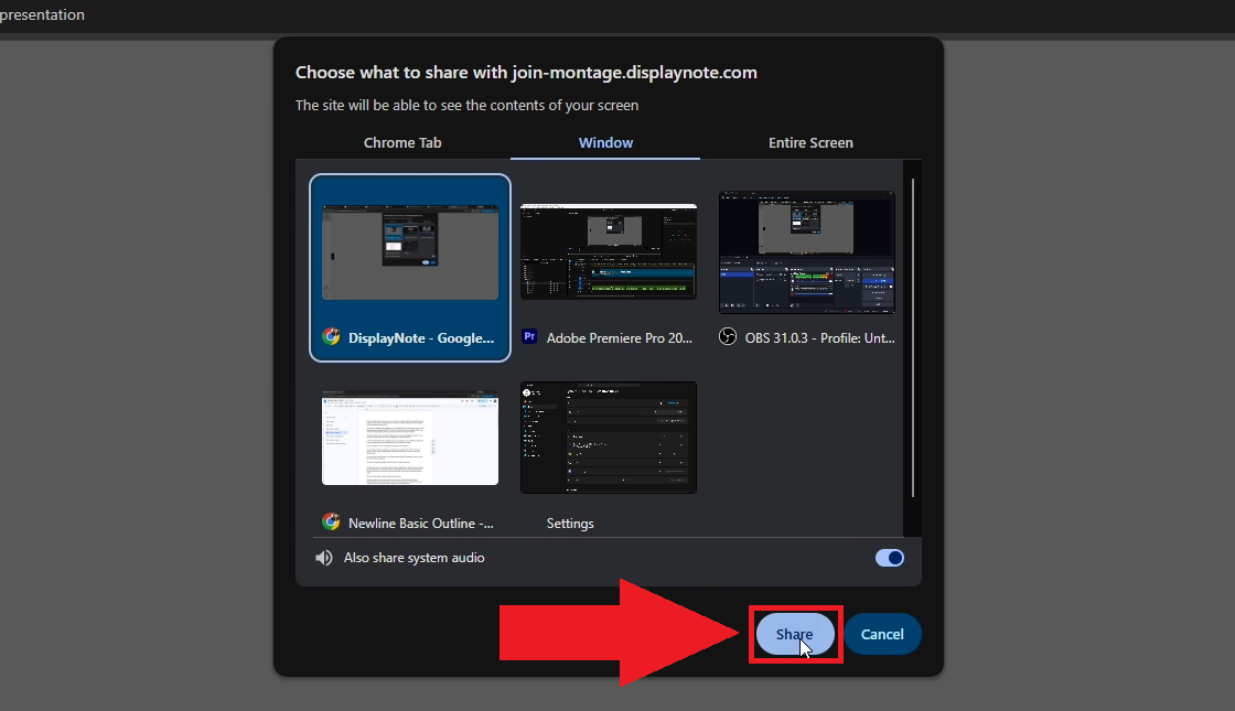 - To start sharing a window, click on the thumbnail of the window you want to share. You may toggle the "Also share system audio" option at the bottom of the selection window if you would also like to broadcast your device's audio.