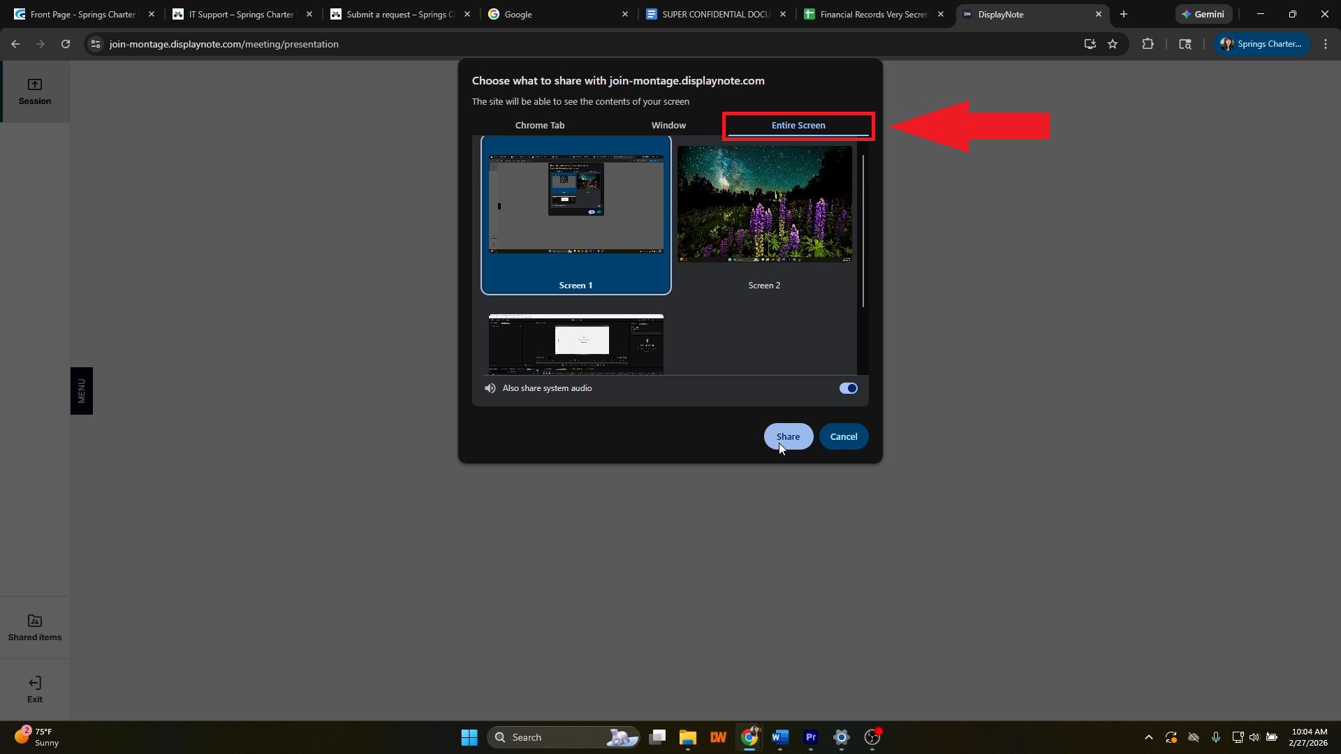 Use the "Entire Screen" option to share an entire screen: This will share all of the contents visible on your Chromebook screen (or other display monitors you may have) and allow you to switch between different windows and applications while sharing your screen. Be sure to not share any confidential information by mistake!