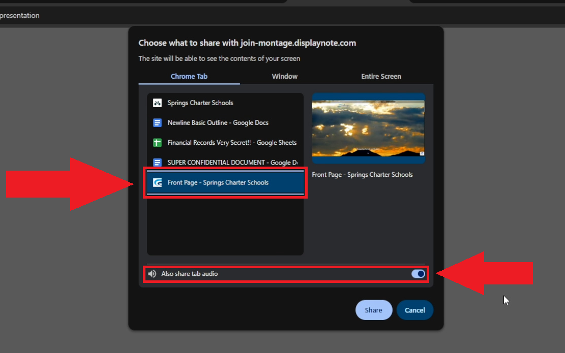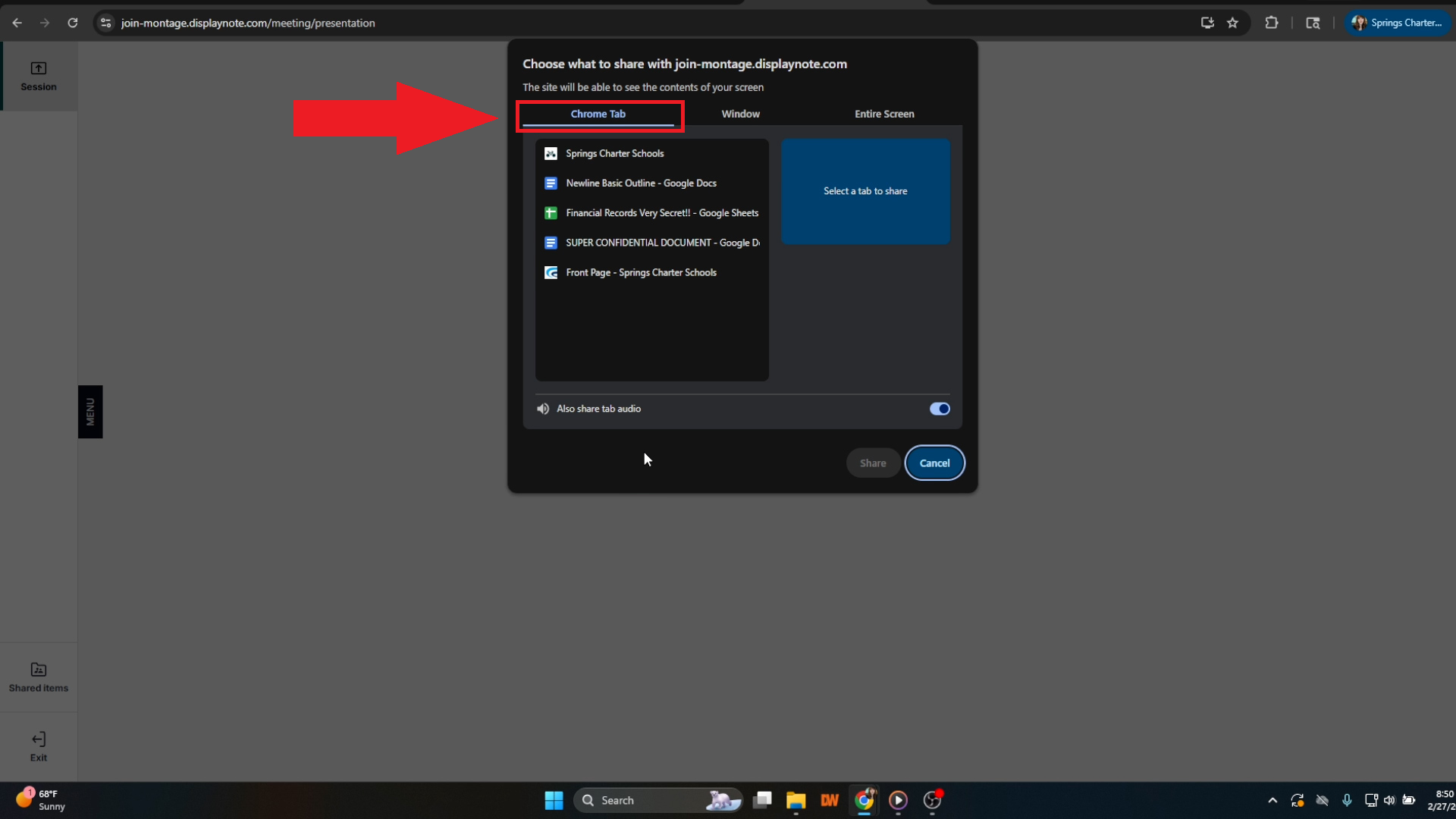 - To share a specific tab, click the name of the tab you would like to project to the Newline board in the list on the left side of the pop-up window. You may toggle the "Also share tab audio" option at the bottom of the selection window if you would also like to broadcast your tab's audio.
