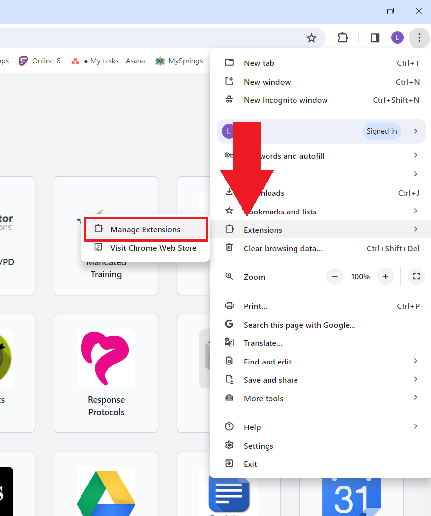 Haz clic en el submenú "Extensiones" y luego haz clic en "Gestionar extensiones".