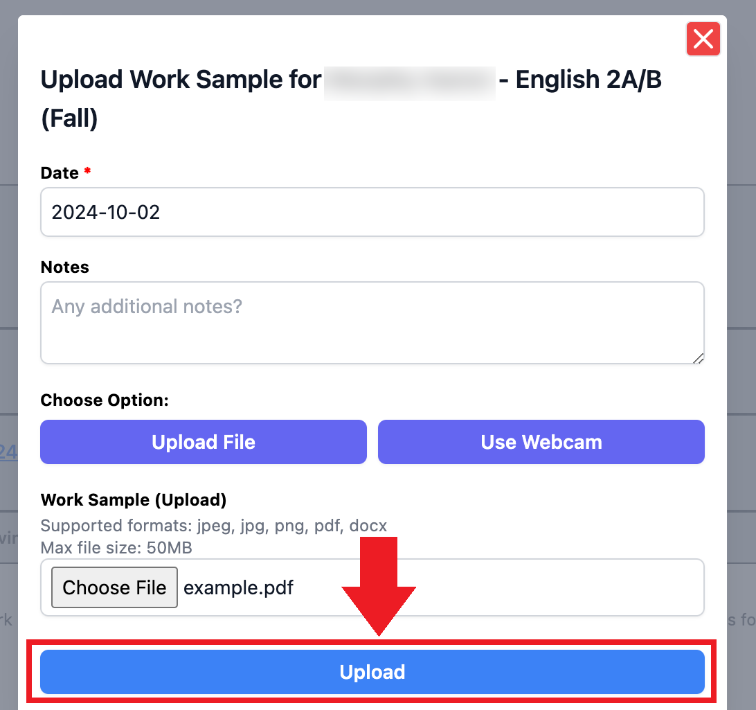 - Si la muestra tiene varias páginas, puede formatearse como un solo archivo para cargar, o bien, puede elegir varios archivos haciendo clic en el botón azul con el signo "+" en la esquina superior derecha de la columna del curso para agregar páginas adicionales.