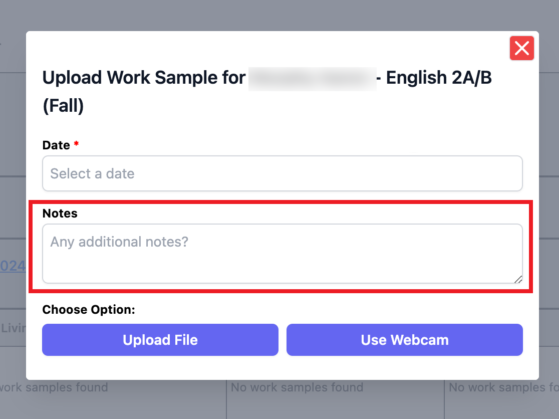 IMPORTANTE: Esta es la única área donde se pueden recopilar muestras. La muestra puede estar en varios cursos/lugares, pero debe subirse aquí para que cuente como tal.