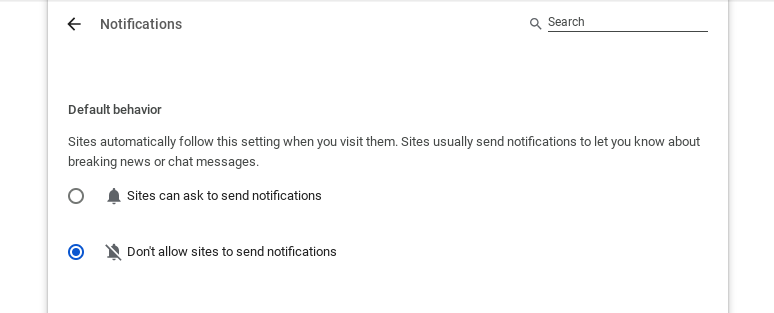 - En la parte superior, en "Comportamiento predeterminado", haz clic en "No permitir que los sitios envíen notificaciones". Esto evitará que los nuevos sitios web que visites te envíen notificaciones.