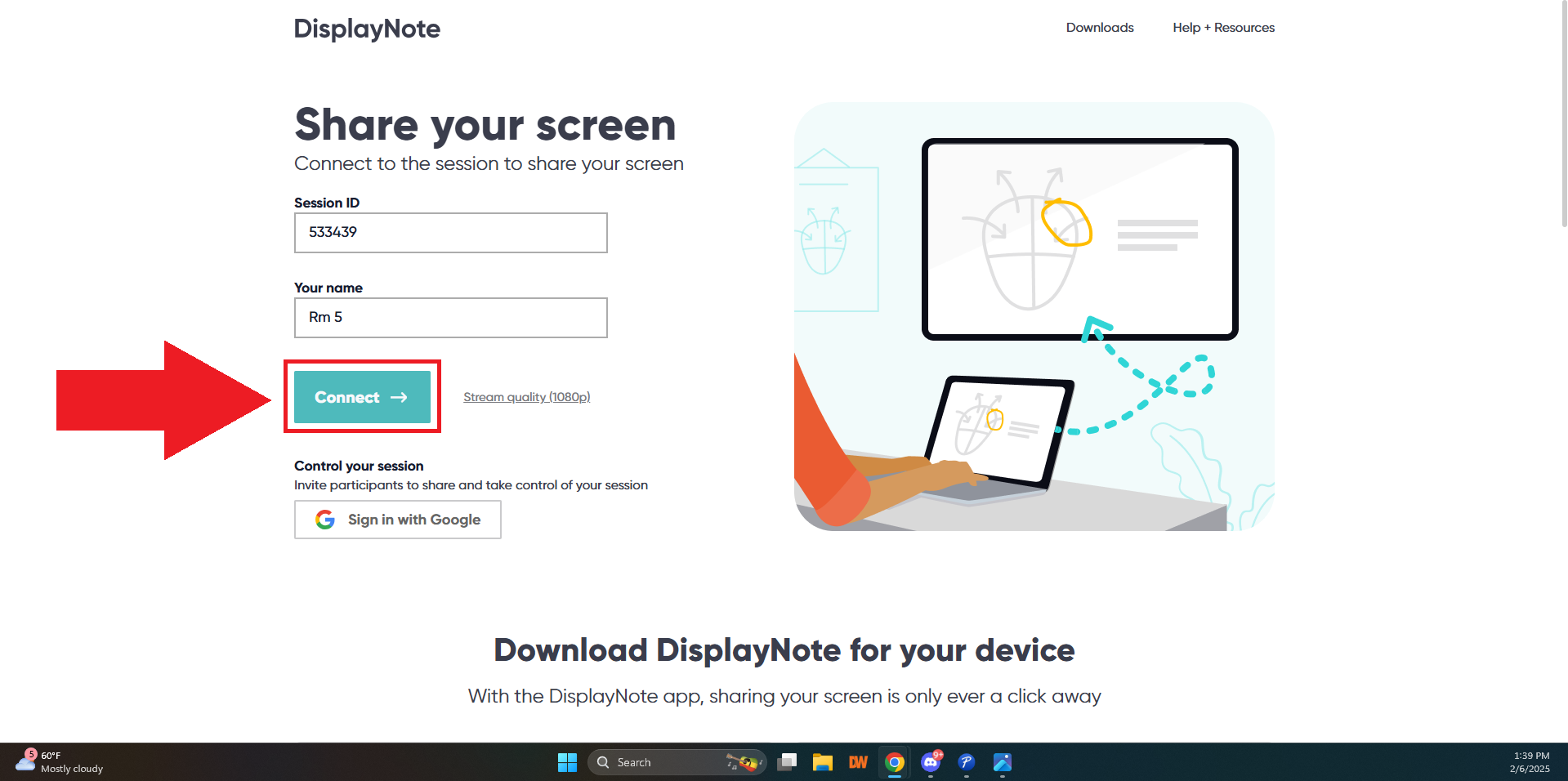 - En tu Chromebook, abre una nueva pestaña en Google Chrome y ve a "displaynote.com/join". En el campo "ID de sesión", escribe el ID de sesión que se muestra en el tablero de nueva línea del paso anterior.