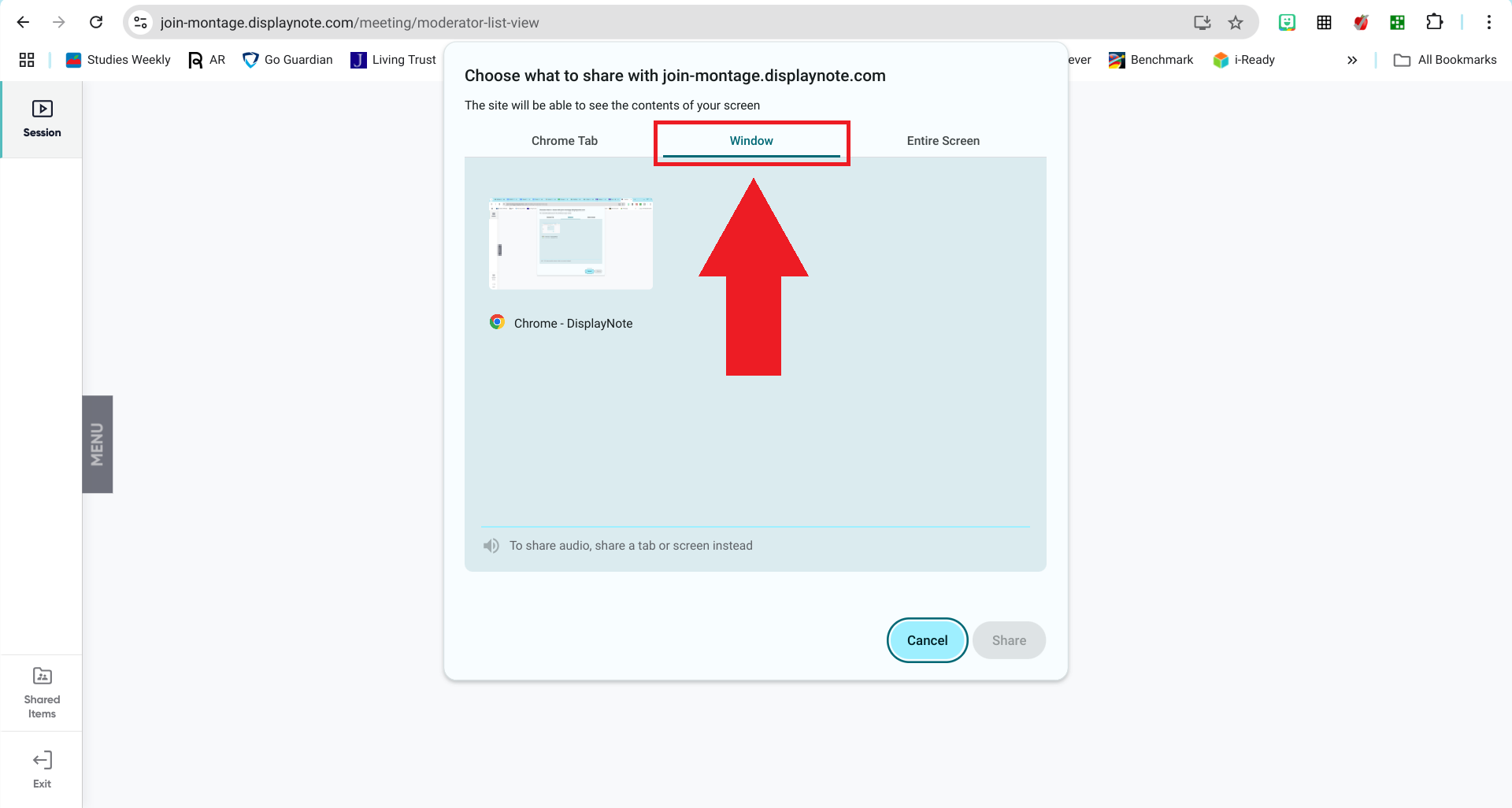 - Para compartir una pestaña específica, haga clic en el nombre de la pestaña que desea proyectar en el tablero de nueva línea en la lista del lado izquierdo de la ventana emergente y luego haga clic en el botón "Compartir" en la esquina inferior derecha de la ventana emergente.