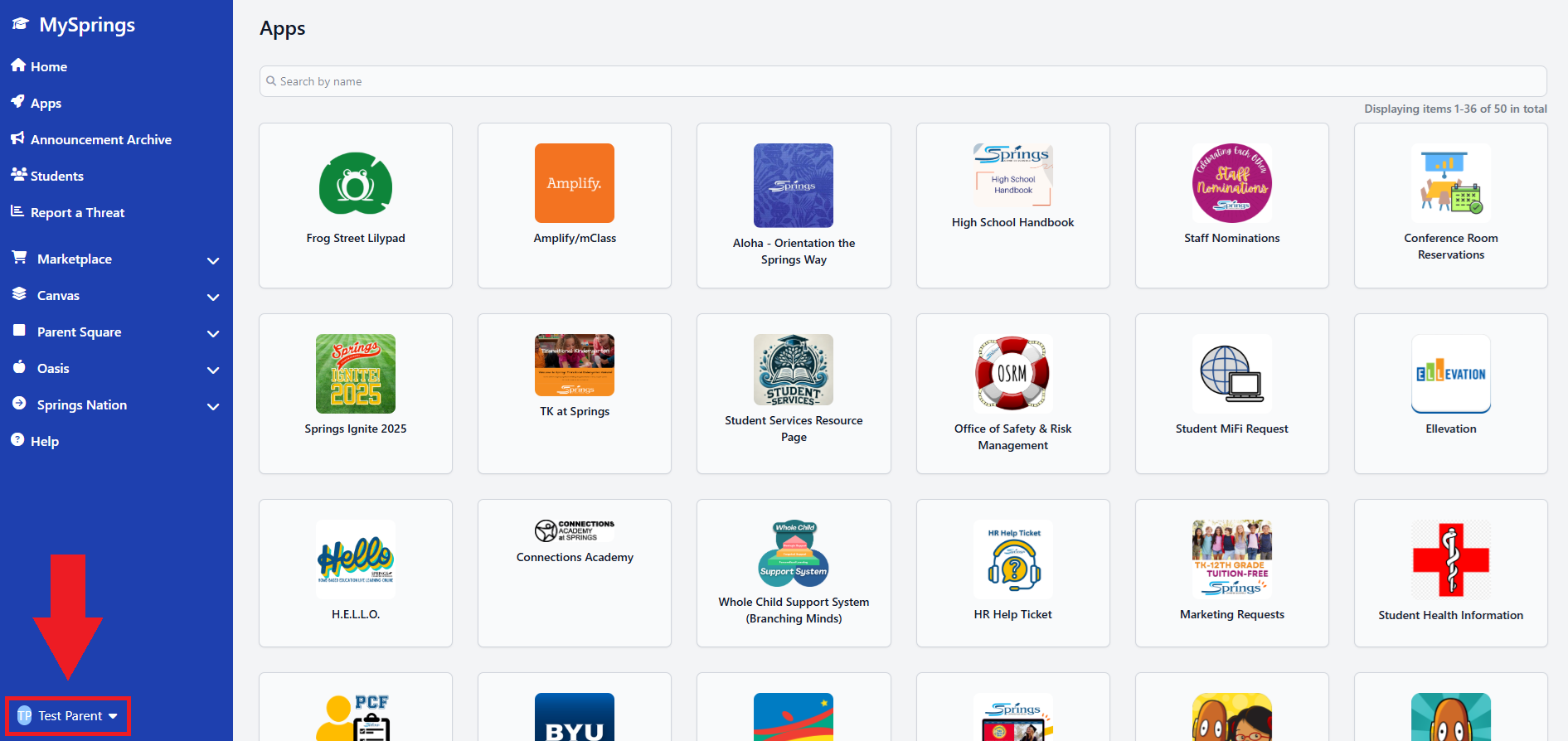 - Revisa el nombre en la esquina inferior izquierda de la pantalla. Si es el nombre de uno de tus estudiantes, debes cerrar sesión y volver a iniciarla con el correo electrónico de tus padres, tal como aparece en OASIS, y tu contraseña de MySprings.
